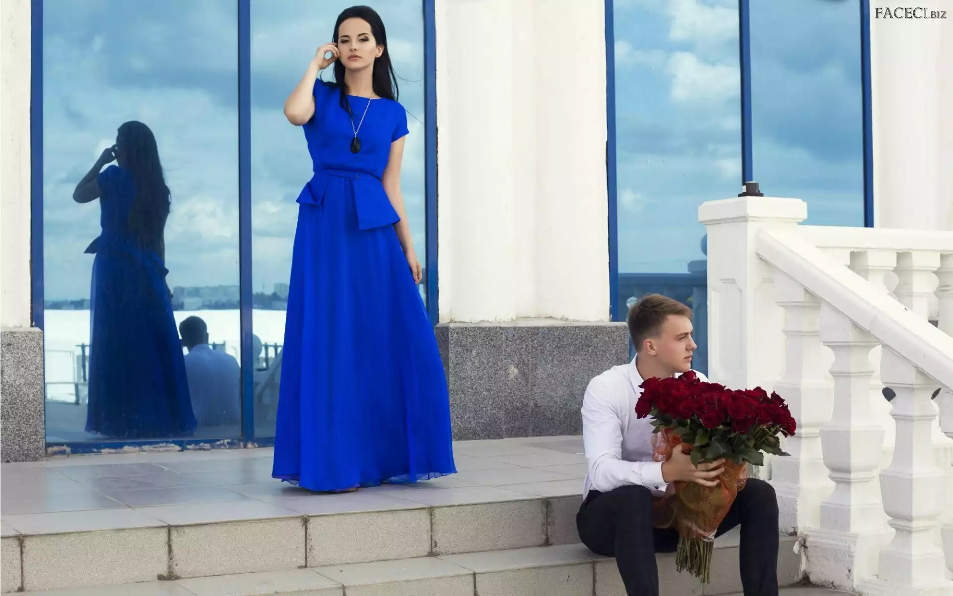 Bukiet, Kobieta, Schody, Budynek, Mężczyzna, Róż - faceci.biz
